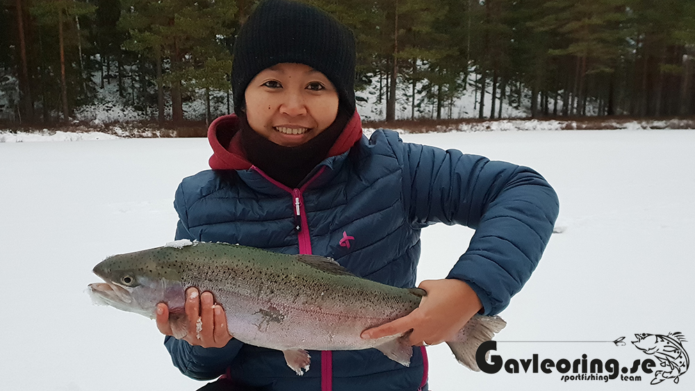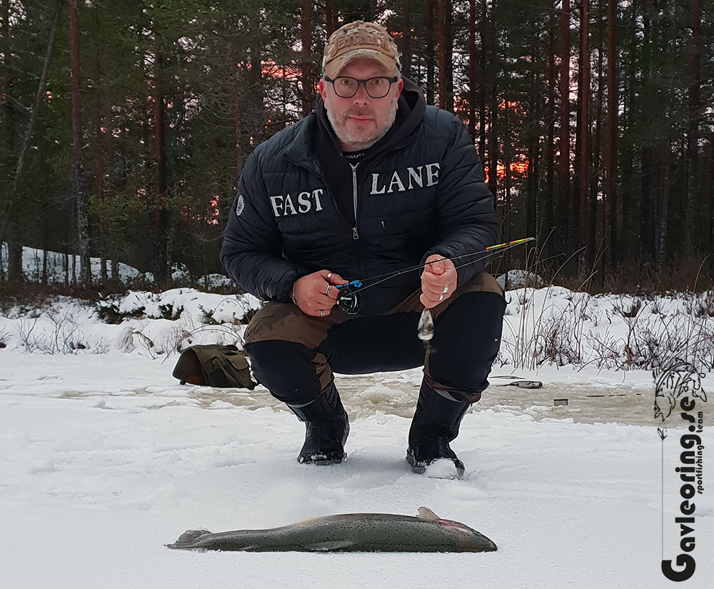 Men efter en stund så kom första riktiga hugget och en 7-8 hg båge kunde dras upp på isen. Vi fortsatte en stund även om det var långt mellan nappen, och när min fröken sa att nu åker vi hem så kom hugget med stort H! Efter flera misslyckade försök att få upp fisken så lyckades jag till slut dra upp en härlig fisk på 58 cm ur isen. Runt 2 kg Nu ska här gravas! God fortsättning!