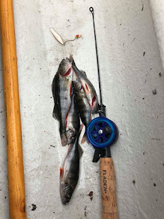 Jag gick över till båtpimpel och mycket riktigt var abborren i stöten och snart nog hade jag fångat åtta små abborrar som blev betesfisk och kattmat.