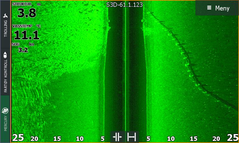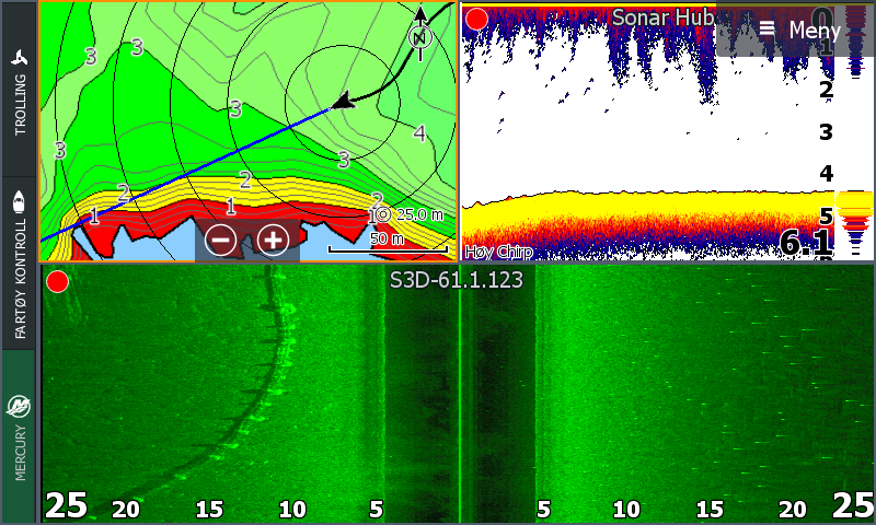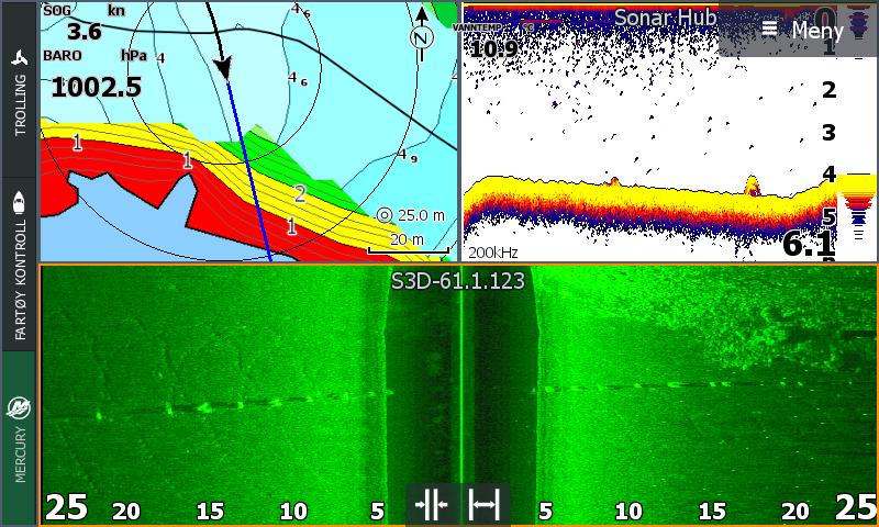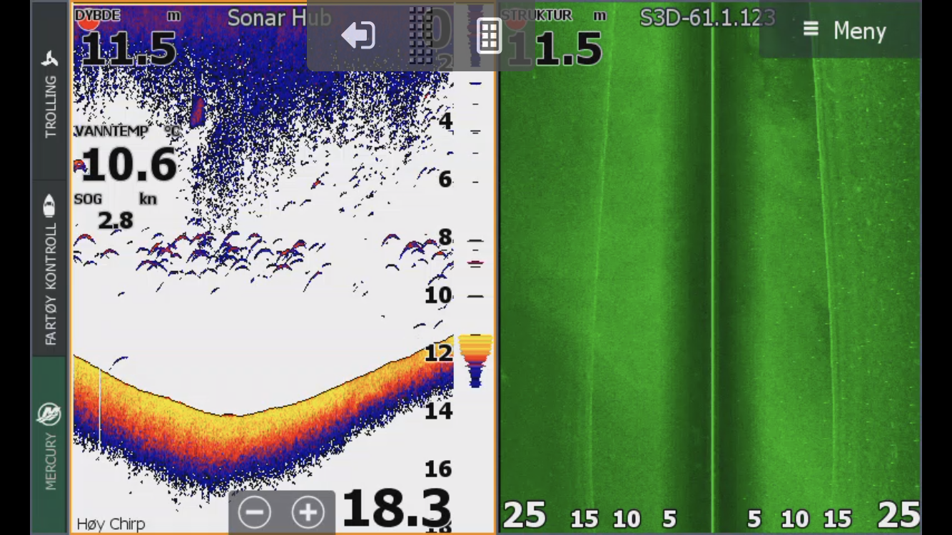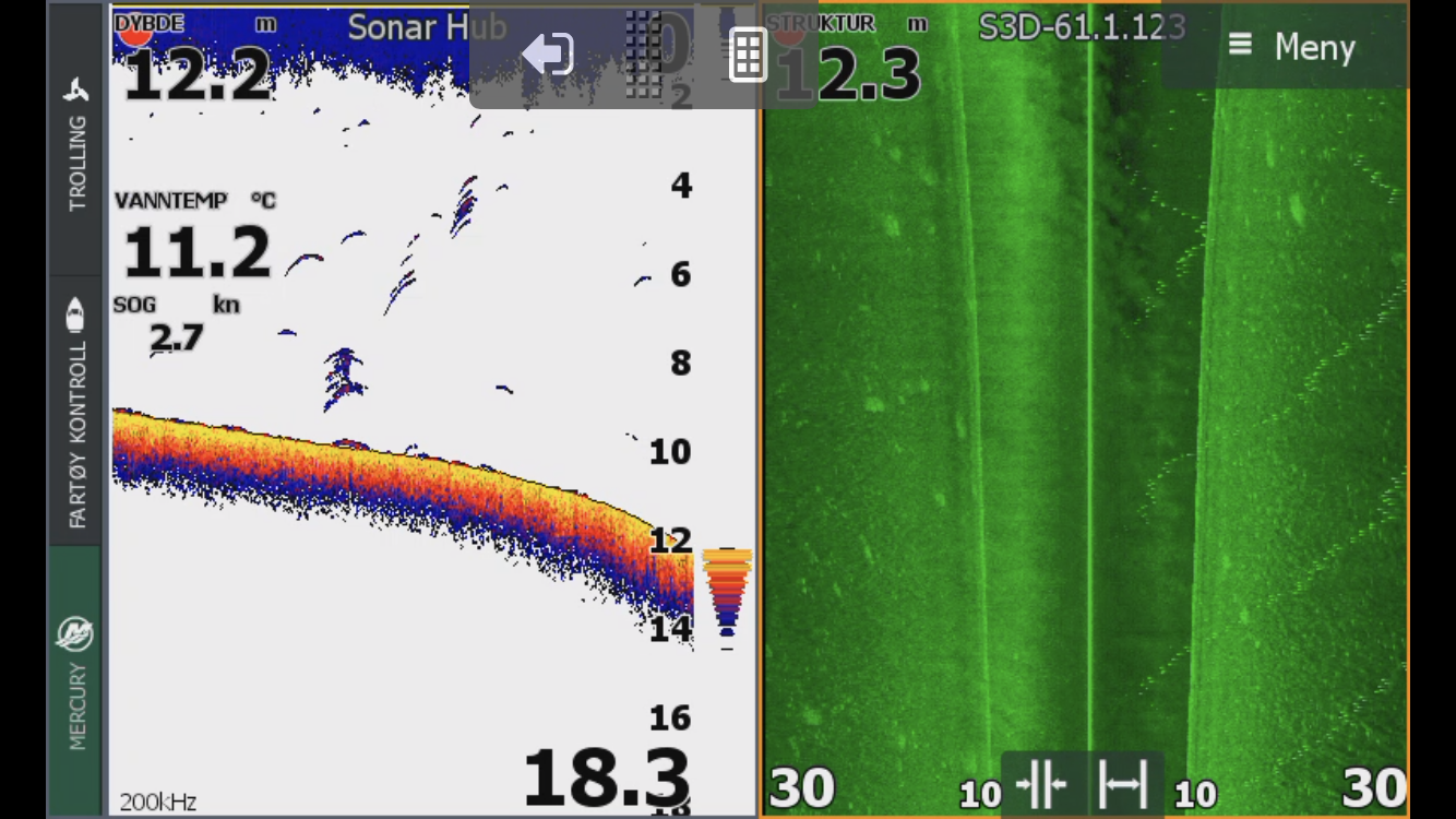 Jeg var på vannet godt etter et eventuelt mårrabett, men vel utpå var det bare å innse at dette neppe ble en kanondag rent fiskemessig uansett tidspunkt. Høyt og ganske møkkete vann, og store mengder pollen. Pollen er helt drepen for skannende ekkolodd, både SideScan og DownScan påvirkes av det og blir rene grøten på skjermen. De tre bildene under her sier egentlig det meste i så måte.