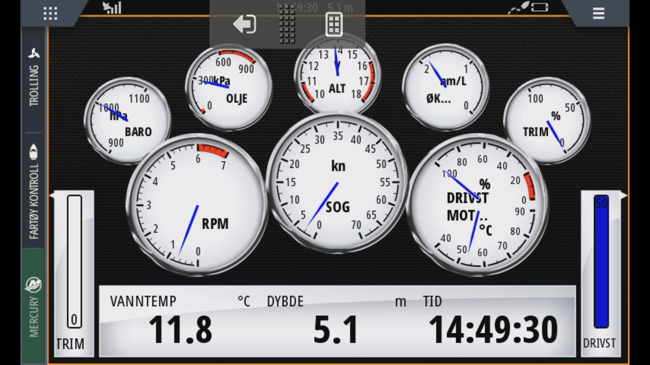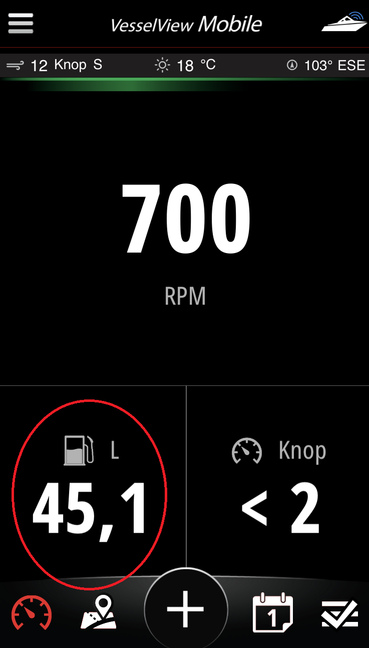 "Tankmåleren" i appen er virtuell, med andre ord en beregning av gjenværende drivstoff basert på sensorer i motoren som måler forbruk fortløpende (fuel flow sensor). Hver gang jeg fyller tanken legger jeg inn hva jeg har fylt. (Tanken i Starwelden er på 50 liter.) Den virtuelle tankmåleren fungerer veldig bra så lenge jeg husker å legge inn hva jeg har fylt, den er vel så presis som flottørmåleren. Tanken i Starwelden er bred og lav, og det gjør at flottøren er veldig utsatt for bevgelse i båten, litt gass så viser den mye mindre drivstoff enn hva som faktisk er på tanken.