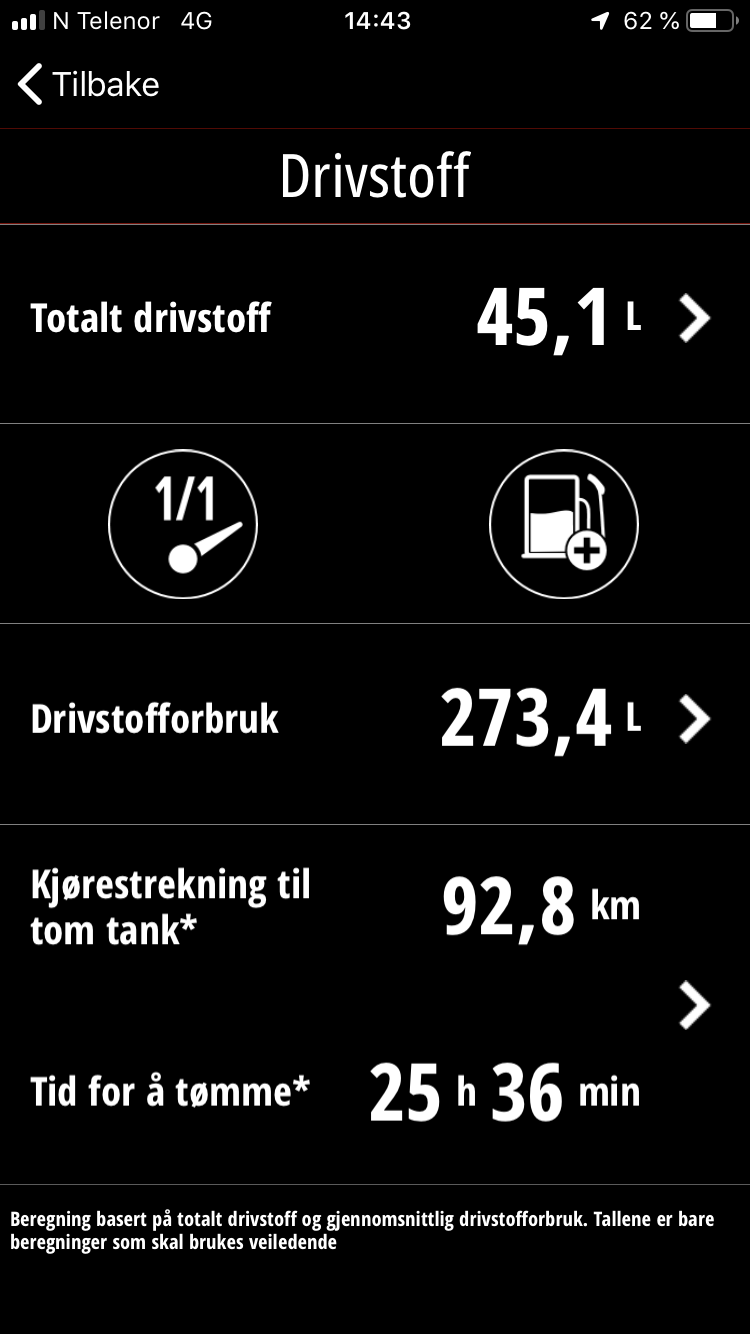 Skjermbildet over er startbildet i appen, appen får igjen motordata fra min Mercury 115 Pro XS via blåtann. Klikker jeg på den virtuelle drivstofftanken nederst i venstre hjørne får jeg mer informasjon om drivstoff: