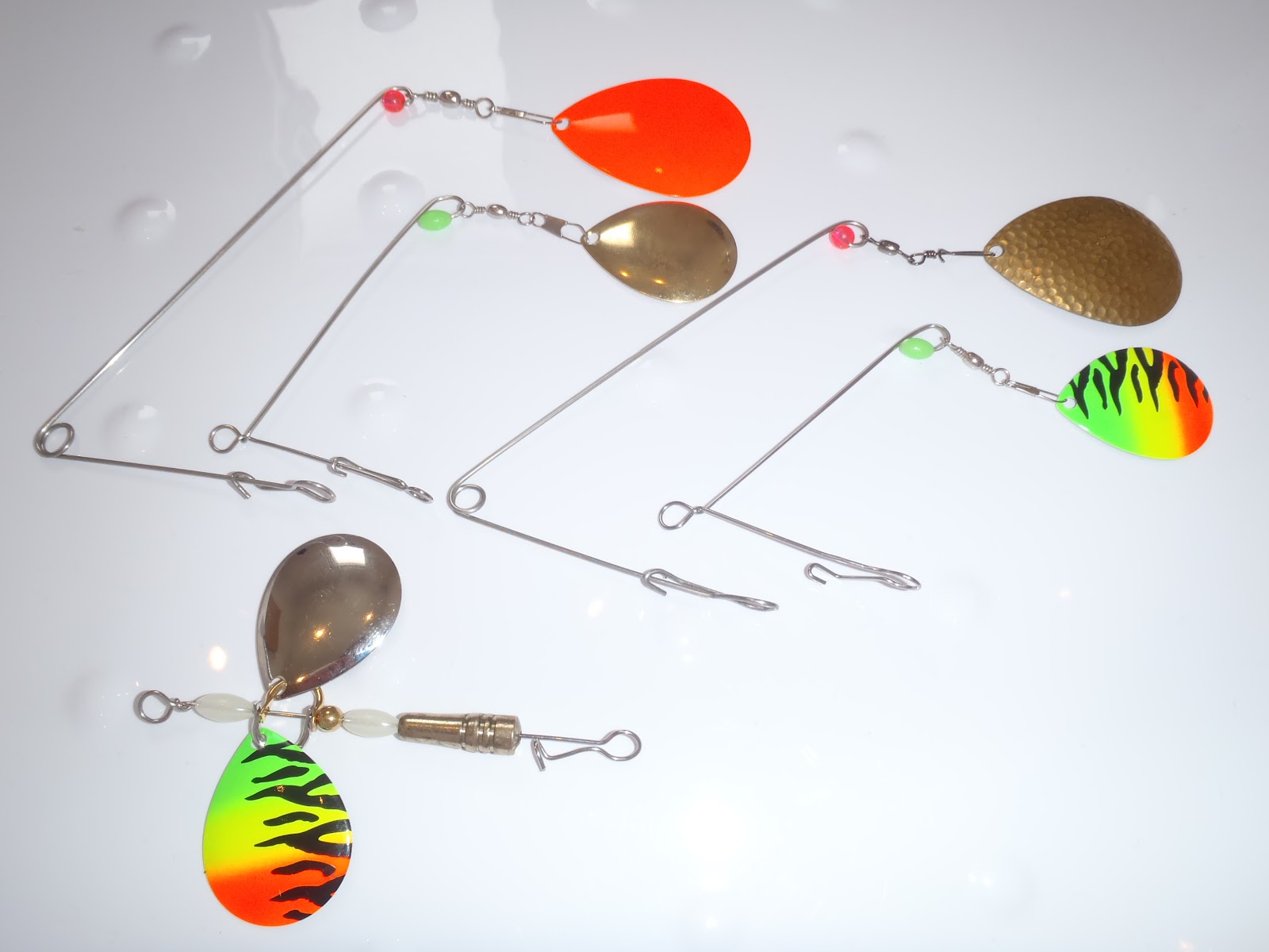 Dessa riggar är kvar- 2 stora med Colorado sked 53mm och 2små med Colorado sked 40mm. En stor med 2 blad är kvar, jag har inte gjortfärdigt så att man kan välja vad man vill ha för färg på skedarna(av det jaghar kvar). Nu är materialet slut så det tar ett tag innan jag kommer attbeställa mera.