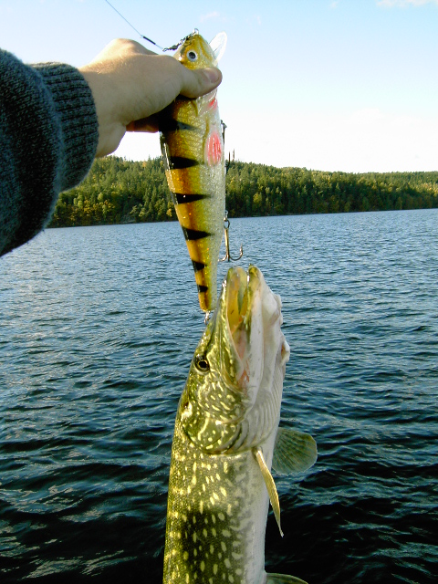 Jag var ute idag och testade en ny wobbler, efter 2missade hugg så satt det en liten gädda på 2.2kg på en " 3D Monster Abborre" på 25cm (wobblerns namn).