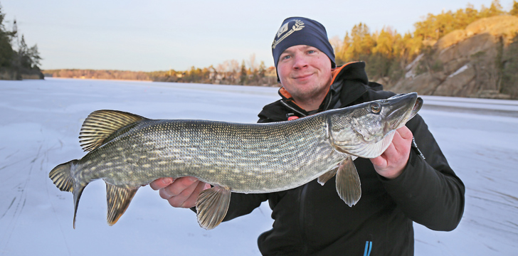 Victor Söderberg har fångat många stora gäddor på ismete. Den här grova skärgårdsgäddan vägdes till 10,35 kilo och mättes till 108 centimeters längd innan den återutsattes av Victor.