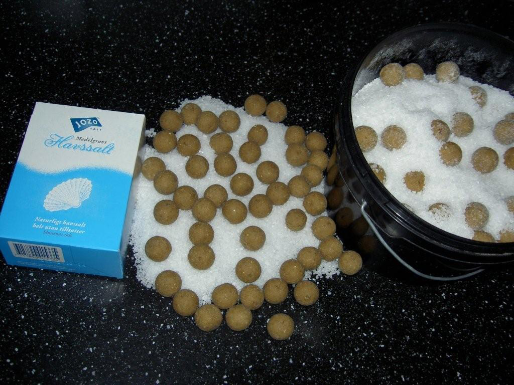 Detta är vad du behöver: Havssalt, Boilies och en hink – ja, det är faktiskt allt! Havssalt innehåller en hel del mineraler som Karpen vill ha och denna ingrediens är billig, jag betalade 7 spänn för 500 gram och inget går till spillo! Du lägger ett kilo boilies i en hink och häller havssaltet över dina boilies till dem är täckta, därefter skakar du hinken och kollar att de fortfarande är täckta av salt. Är de inte det får du tillsätta mera, dina beten skall vara täckta. Nu är det bara att låta dem stå i hinken i 1-2 månader eller om du vill ännu längre. Dina boilies kommer att suga till sig saltet under tiden och när du sedan fiskar med dem kommer saltet att sakta laka ut ur dina boilies och det lockar fram Karpen till din mäskplats!