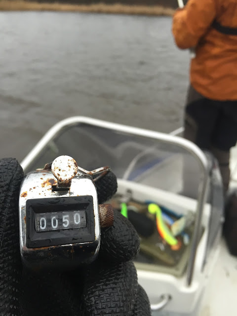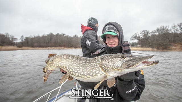 We continued on to some new areas and rain started to pour down. For a short moment we even had a mix of snow and rain. Pikes went slow again but in the afternoon we managed to find a few spots that delivered well. Pikes were almost flying in to the boat since we ended up with 50 pikes! Nice result for being March and 2 degrees in the water. Another big fish was landed by yours truly before the end but she didn't reach over the meter margin.