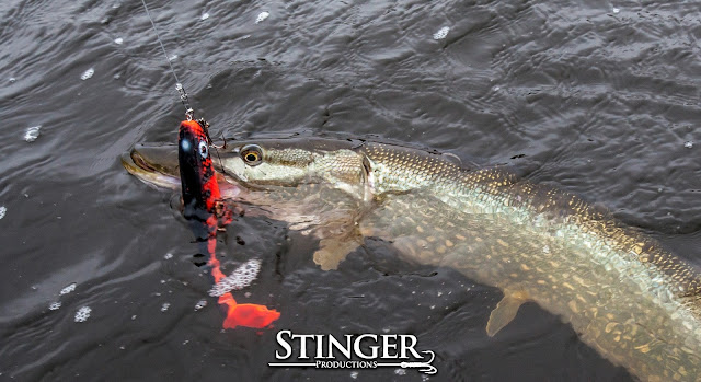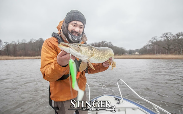 Since Saturday wasn't to good our expectations for Sunday wasn't much better. Still cloudy and cold, 2-3 degrees in the water and wind from east/north-east. This day we decided to go east and tried several bays. Fishing started out slow with only two small cucumbers in a couple of hours. Finally we found a spot where fish was active and pikes started to bite on everything. Soon enough we were up to 19 pikes and I had a super cool strike close to the boat. I used a Red tiger McPike 25cm and looked at it as it came close to the boat. Out of nowhere a massive mouth opens up and inhaled my lure.