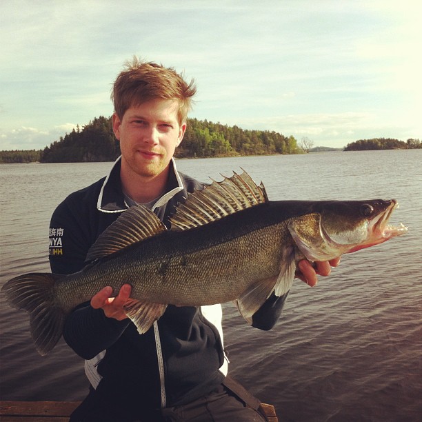 Har varit ute ett par ggr nu och för någon vecka sen fick jag en grann gös på 3.7kg. Jag och tjejen hade vertikalat och var på väg in med två mindre Nils master i släp, precis innan vi skulle dra upp så small det på mitt spö. Kändes som en trött kilosgädda tills den kom in under båten och vände buken. Väl i håven kom jag på att telefonen låg i bilen, så gösen fick åka med i full rulle in till bryggan där tjejen gav den syre medan jag hämtade telefonen för fotning
