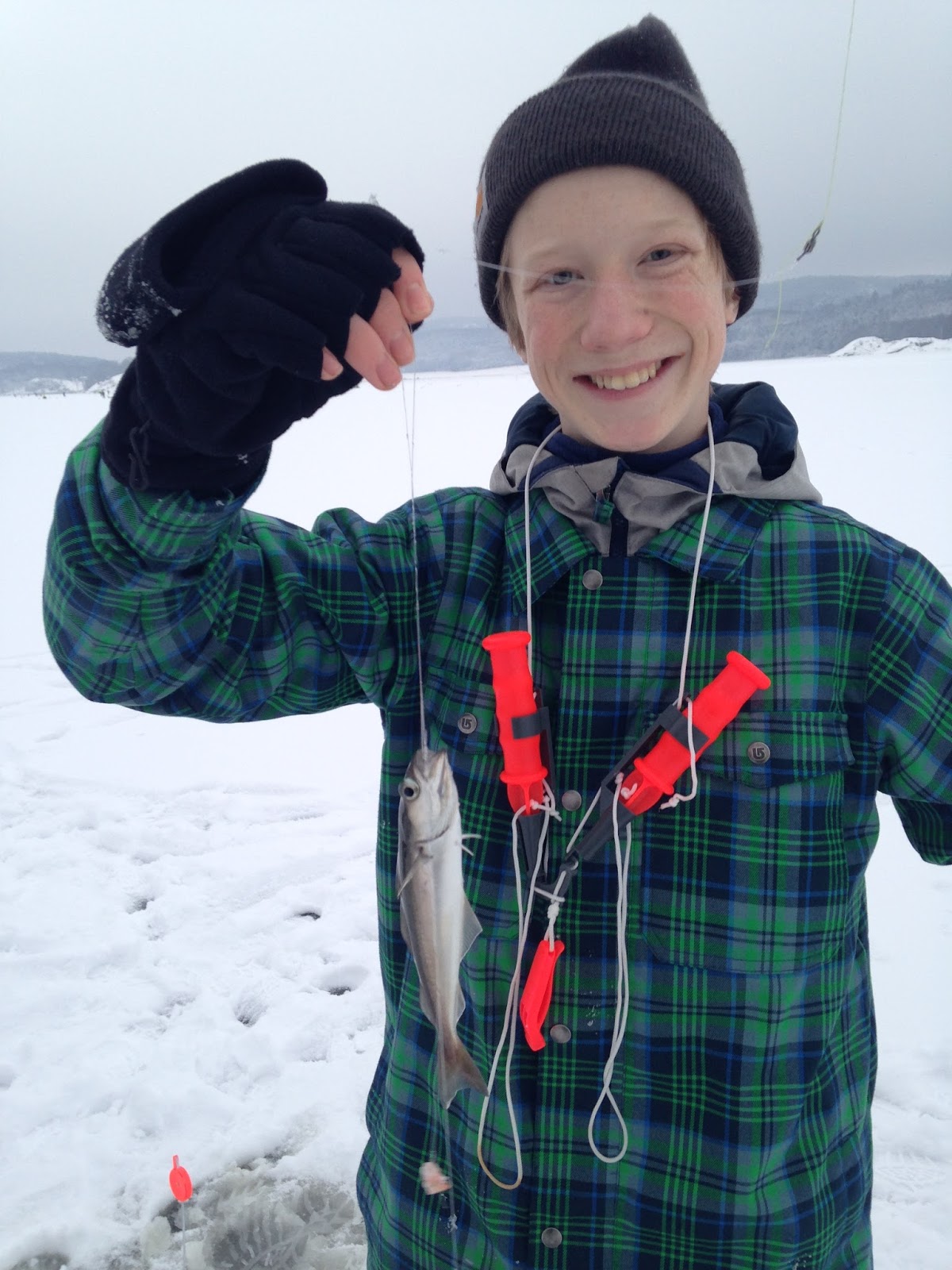 Mothugget sitter och Freddy drar upp en torsk och en liten platt fisk på sitt tackel...