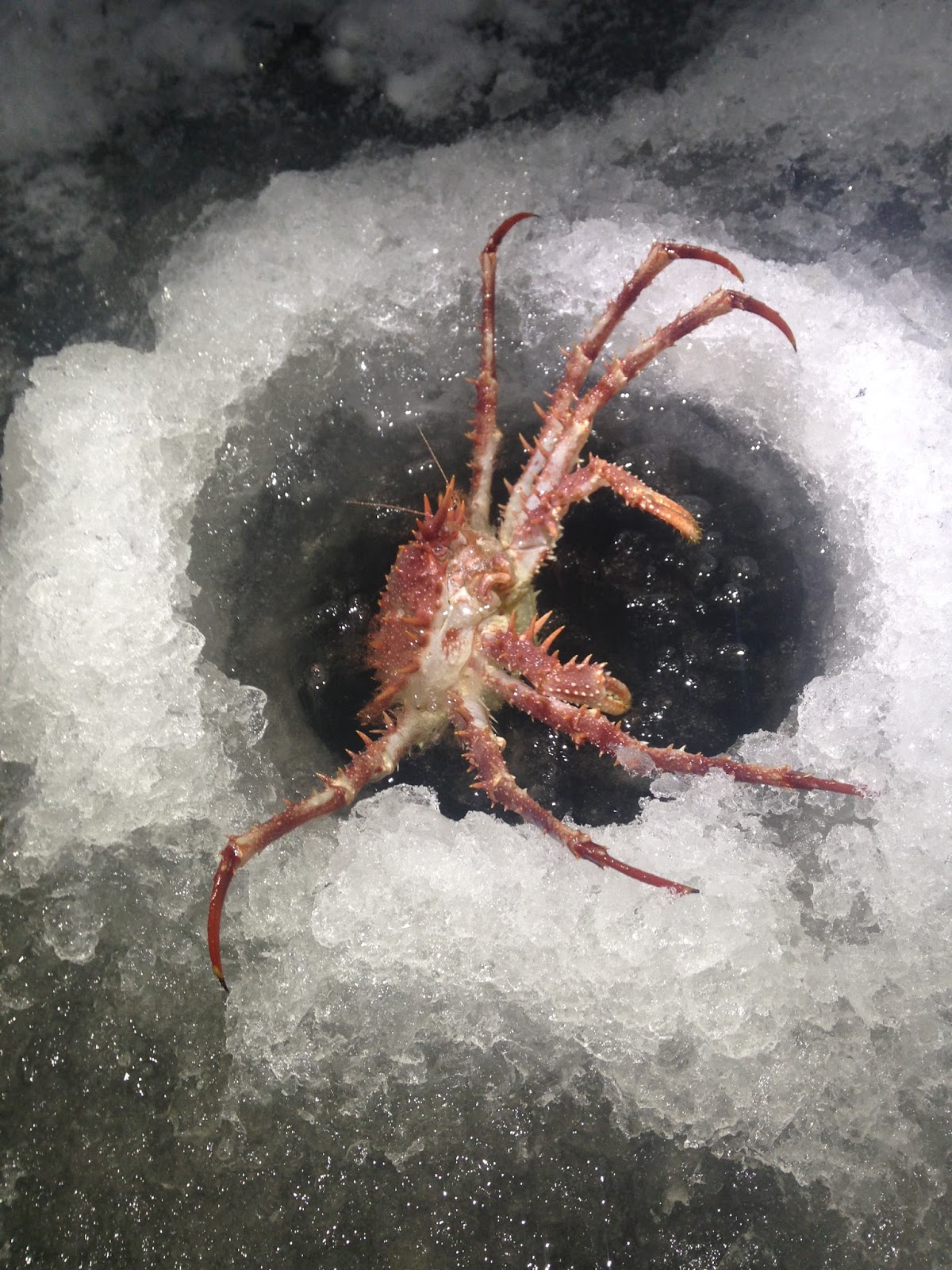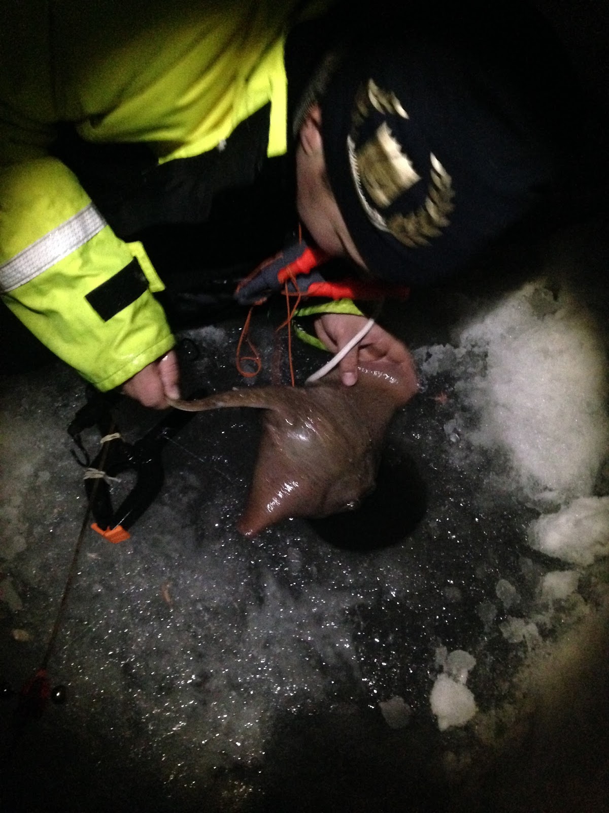 Upp till hålet kommer en fet rocka som precis går upp genom hålet i isen.