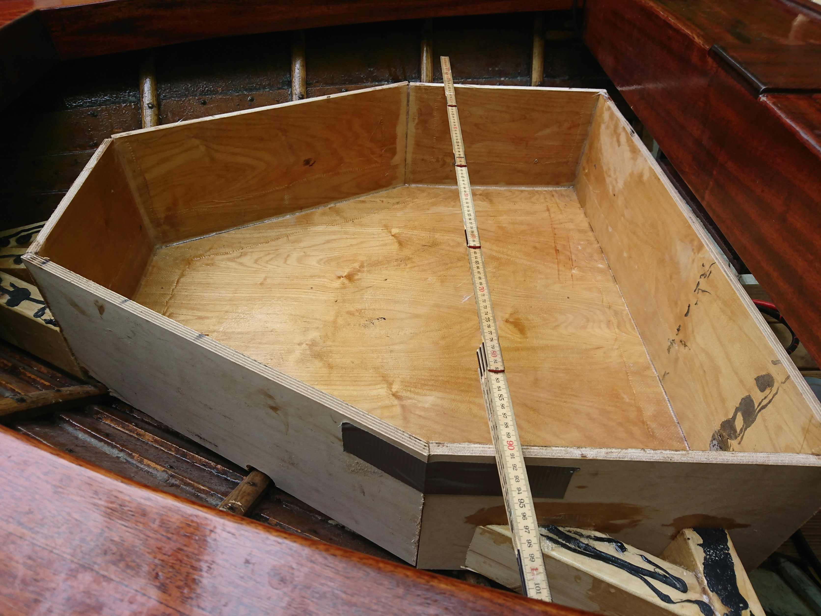 Hej! Har en liten fundering om min förvaring i fören på båten. Jag håller på att bygga ett utrymme på 100 liter. Min fundering är om man skulle tagit det främre utrymmet framför tummstocken och gjort kyllåda.