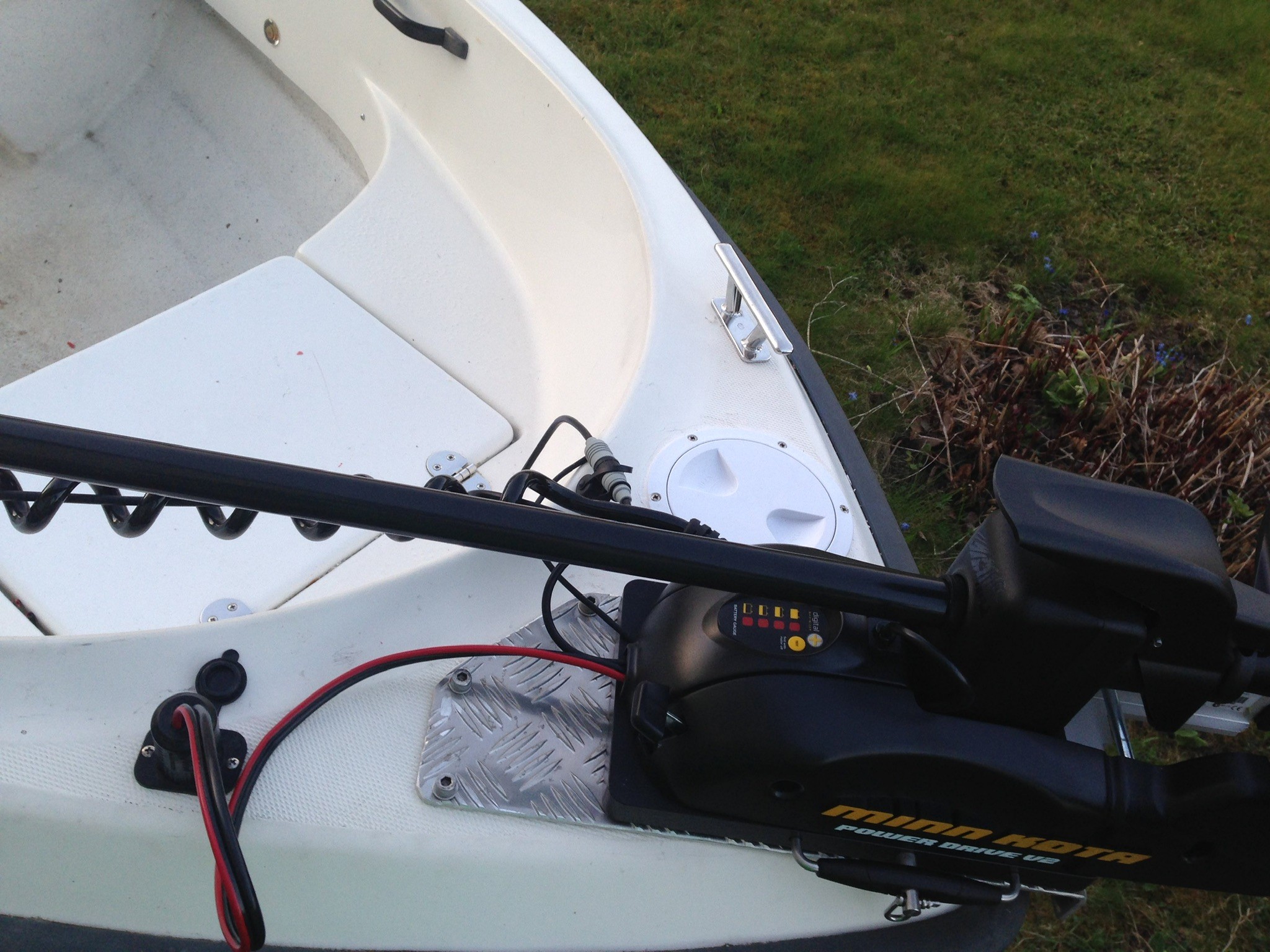 Jag har en silver hawk 520 men tycker den den påminner en hel del om den triangulära formen i fronten på din båt. Jag har 4 mm (?) aluminium som är bockad och fäst med 3 skruvar och mutter. Går säkert att göra det på annat sätt och även snyggare, bara fantasin som sätter gränser. För mig har det hållit elmotorn bra på plats vid transport i högre farter samt vid körning i snart 5 säsonger. Ger bra fäste vid regn o.s.v.