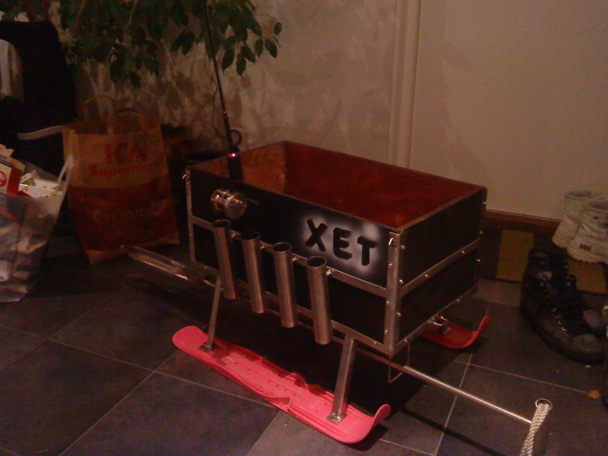 En suverän lösning är att hitta en kasserad snowracer. Skruva bort ratt, frammed och sits och skruva på en plastback istället. Sen monterar du spöhållare runt om på utsidan och använder en kylbox som beteshink. Borra hål framtill i medarna och montera ett rep i lagom längd emmelan med ett draghandtag på. Har byggt 2 nu och både min och polarens fyller sin funktion till 100%! till och med terränggående (till en viss gräns då).