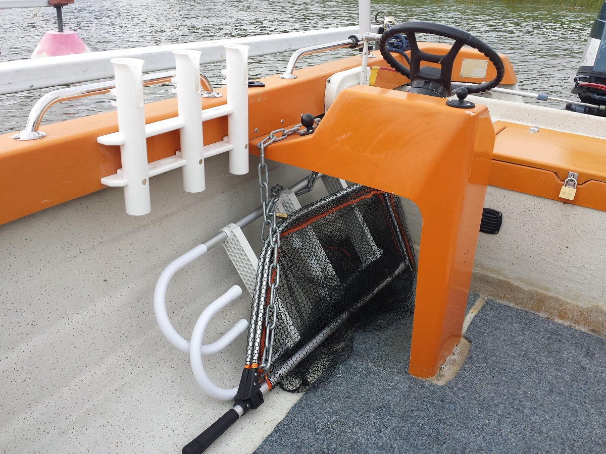 Exakt. Fäller du ihop den så tar den inte alls mycket plats. Här är en halvdålig bild på håven i båten när jag var ute med 2 polare (notera att håven av nån underlig anledning inte var helt utfälld på bilden, troligen mina (o)kunniga vänner...)