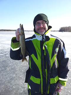Göran och jag fick en fin start på morgonen, redan 06,50 när vi satte ut våra ismeten fäller det på mitt innersta spö och upp kommer en femkilosbit. Den är ganska fet och skvallrar om att här kanske det finns fler och större...