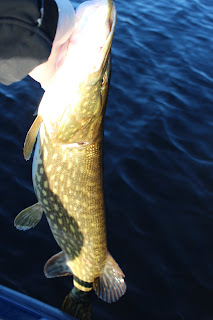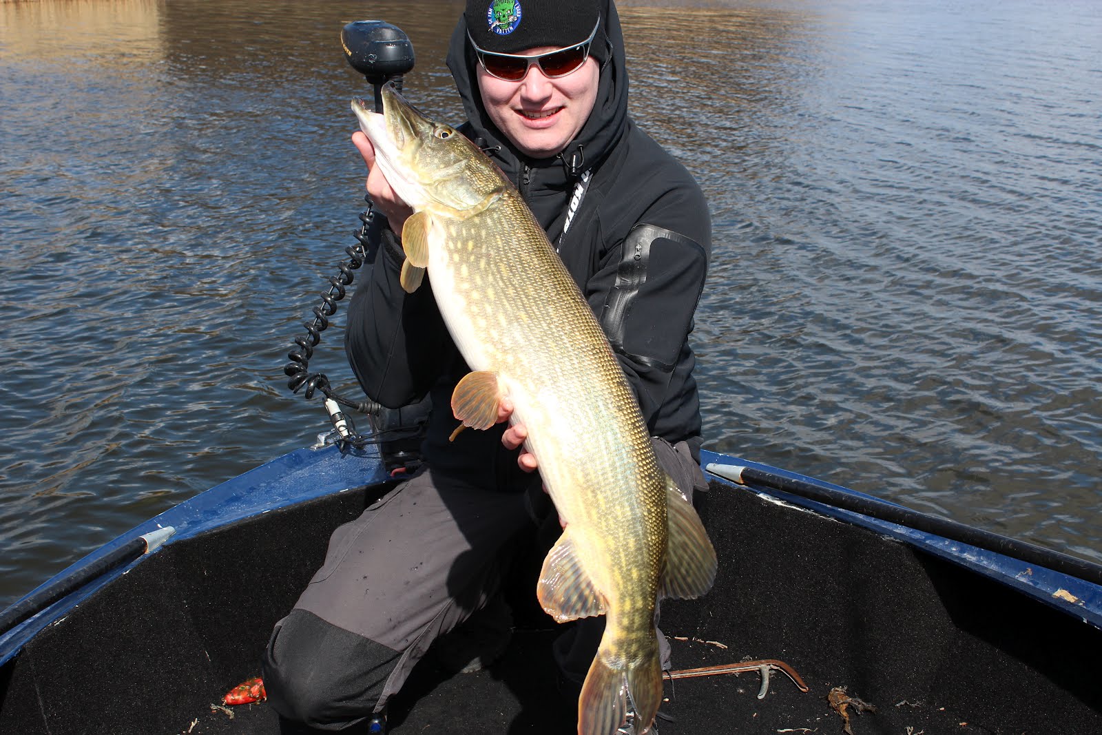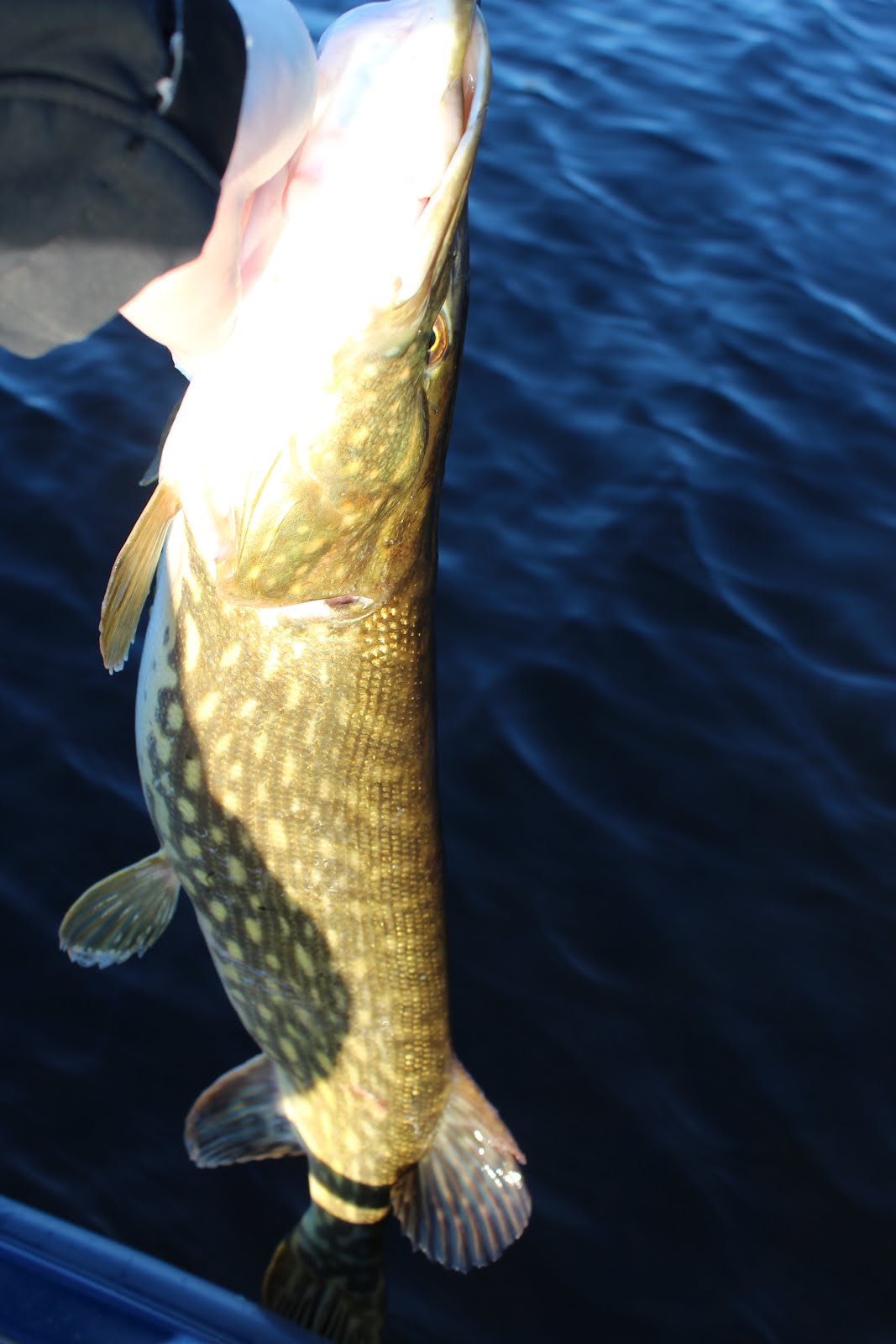 Efter detta blåste det upp ännu mer och det blev väldigt svårfiskat. Vi hittade lite lä i en grund vik så vi har fiskat i några gånger tidigare. Här var det inte djupare en 50cm men det hindrade inte att gäddorna. Vi satte båda på varsin shallow Big bandit i färgen brown trigger och fiskade dem långsamt över sandbottnen. Vi fick snabbt ett par gäddor och josen hade en riktigt bastant dam som tog en närmare titt på betet innan den vände inne vid båten. Efter detta orkade vi inte med den hårda vinden mer och begav oss hem. 15-20 gäddor lyftes och hade det bara varit några grader varmare i vattnet så hade vi säkert fått många fler.