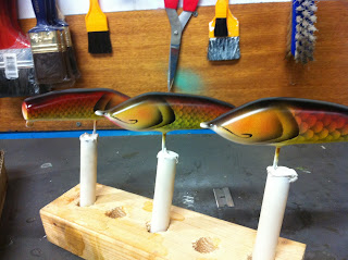 Nu e det full fart i målarverkstaden. På tapeten är det 22 st beten som målas varav 10st Mcmanus tail samt 10st Caesar tail.
