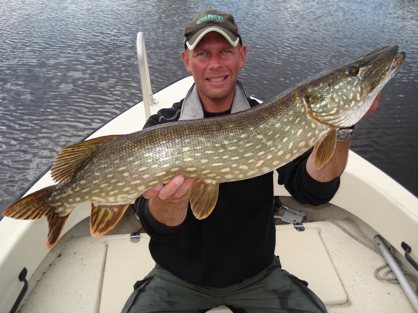 Det blev en ganska bra eftermiddagstur,knappa tio gäddor men med en bra medelvikt toppar på 8,5kg 105cm och 7,7kg 101cm får väl räknas som bra med tanke på åska o regn,jag och Andreas var ganska nöjda när vi åkte hemmåt i solnedgången sverige är ett härligt land med sina årstider skulle inte överleva utan dom !! På bild Andreas med fin gädda strax under metern och undertecknad med en mindre gädda !! Skitfiske och "Bänd Hårt Nicke"