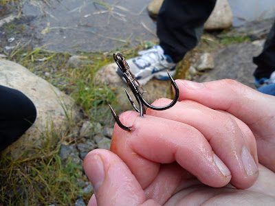 Under tiden som tång och avbitare hämtades (detta ska ALLTID finnas med när man fiskar) så tog vi loss betet och alla stingers från tafsen så att inget mer skulle fastna om gäddan skulle bli arg. Med tång lossades kroken från gäddan så jag kunde släppa greppet om den. Nu var det lättare att se vad situationen var. Jag kände lite på kroken och kunde konstatera att den i alla fall inte satt i själva leden utan bara under huden vilket var en extrem lättnad. Jag är en sån person som verkligen inte tål att se på skador och blod, inte när det är på människor. Allt börjar snurra, det ringer i öronen, man blir kallsvettig och yr och mår allmänt skit, riktigt jobbigt. Jag fick lägga mig ner och dricka lite vatten för att få tillbaka blodet i huvudet och inte svimma.