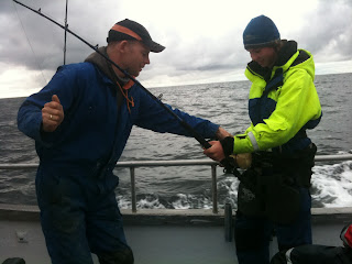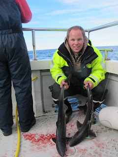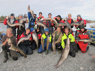 Här är jag med en av dagens tre lubbar för egen del, 2,9kg vägde den största. Bredvid mig två elever, Carl-Anton med sej och Johannnes med långa.