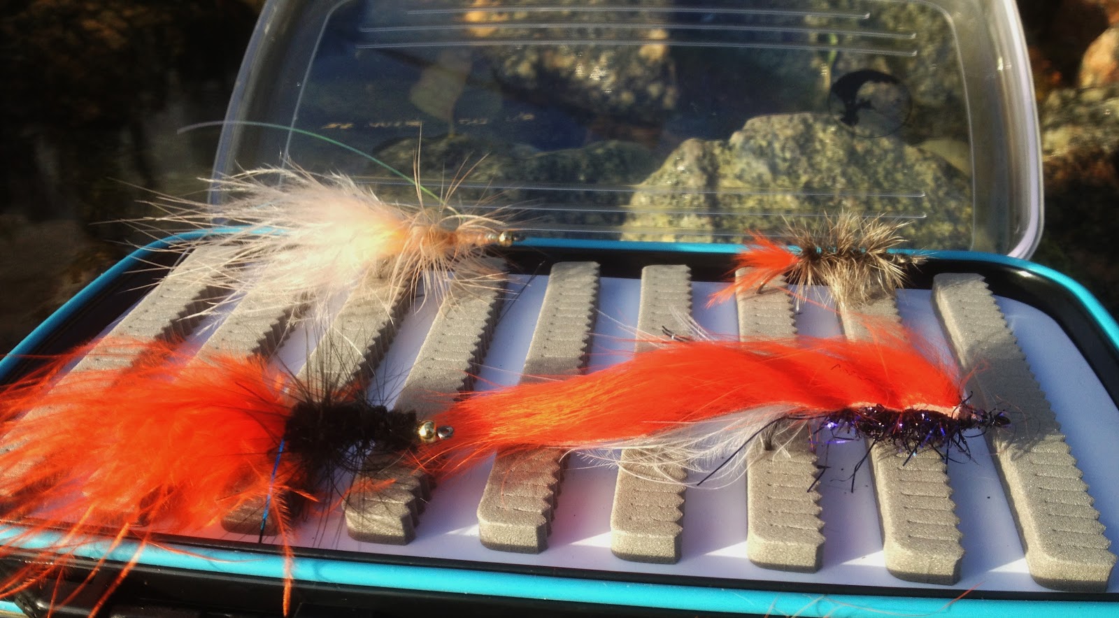 Fyra flugor samt en stor dubbelsidig streamerask med transparenta lock. Osänkbar.