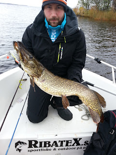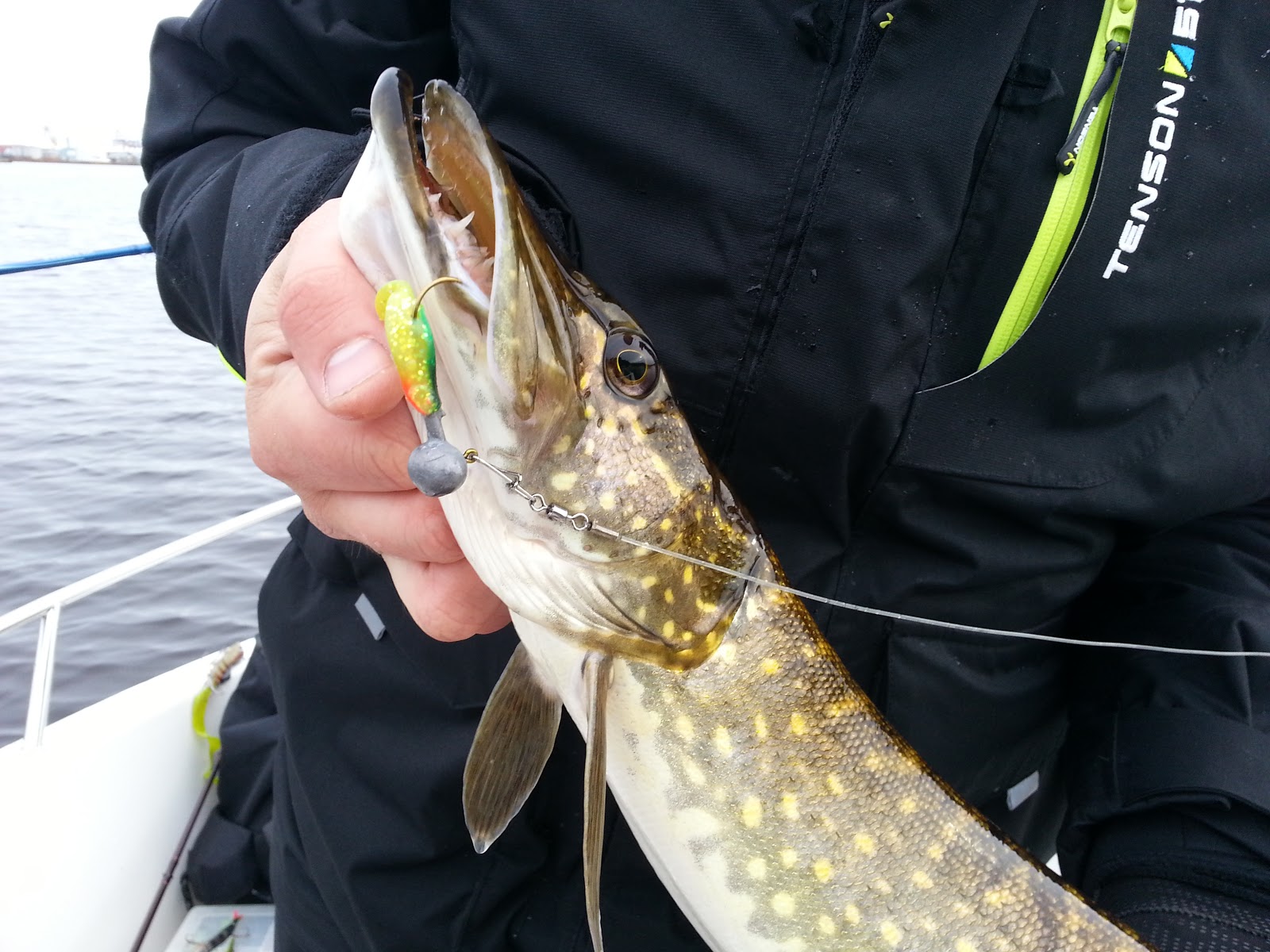 Ett kast senare satt nästa hugg, denna gång var det en plastpåse och den va inte alls lika rolig att drilla. Nog för att det är kul att få "nya arter", men det var ju varken stockar eller påsar vi var ute för att fiska. För att även Andreas och Nicklas skulle få känna lite spöböj så åkte vi till ett abborreställe med fiskgaranti, och mycket riktigt så börjades vi dra borre till höger och vänster. Niclas beslöt sig för att fiska världens minsta jígg med världens största huvud. "Får du fisk på den där så bjuder jag på pizza" hörde jag mig själv säga. Smack sa det sen var det min tur att bjuda Niclas på pizza. kombon kallas nu mera pizzamaker och levererade även gädda. När vi hade tröttnat på abborre så åkte vi vidare för det vi åkte ut för, gädda. Men innan det var det julklappsutdelning och tomten Andreas gav mig och Nicklas en varsin Orka jigg som än så länge saknar namn och inte finns i butik. Nu skulle det dras gädda! Vi ankra upp och under hemtagning av ett kast titta jag ut en plats och tänkte där ska jag lägga nästa kast. Niclas fick dock hem sin jigg före mig och prickade mitt spot precis. Jag han bara berätta för honom att jag precis hade tänkt lägga min jigg där så sa det smackebonk som Buster skulle ha sagt. En fin gädda på 5,8 kg och 102 cm hade slukat Niclas nya orka jigg.Den nya Orka jiggen levererade alltså omgående och jag kan verkligen rekommendera er att kolla in den när den kommer i butik. En riktigt lugn och fin gång har den. Jag tror inte att det där va den sista gäddan som jiggen levererade i år.