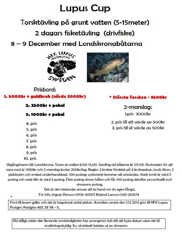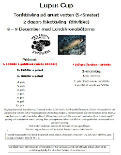 Helgen den 8-9 december arrangerar Lupus en torsktävling på grunt vatten och där finns platser kvar. Passa på att anmäla er till en trevlig tävling som arrangeras väldigt bra. Vi kommer själv att deltaga i den. Mer info hittar ni här.