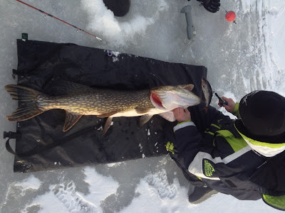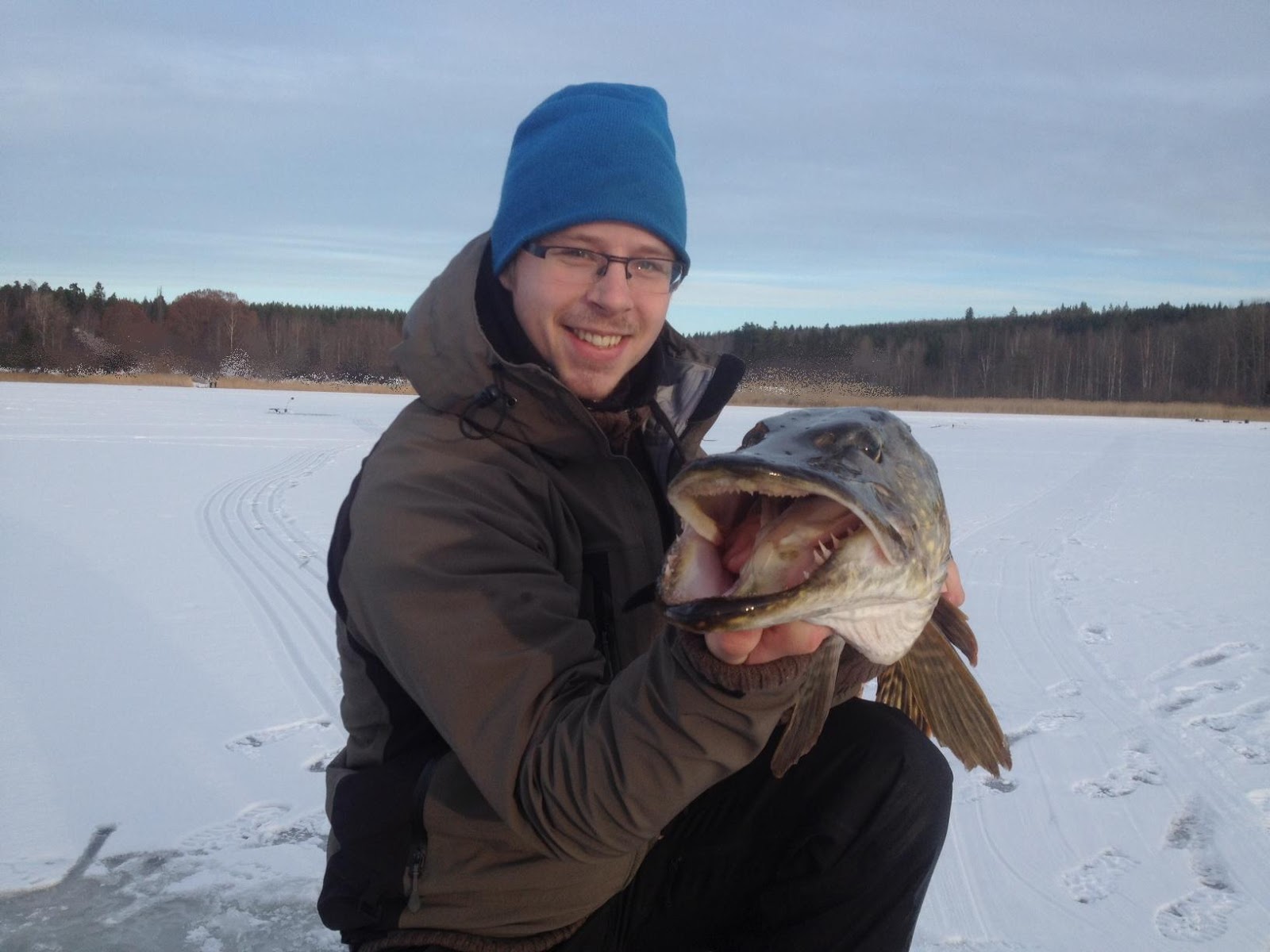 Igår var jag och Jonas Nyström iväg till en liten sjö för att ismeta lite. Dagen började relativt bra, vi fick springa en hel del. Dock så var storleken ganska dålig, största låg någonstans runt fyra kilo. Tiden gick och huggen ebbade ut, fokus lades med tiden över på att snusa, dricka kaffe och äta. Klockan ett fick jag dock springa en vända igen. "etthugge", visade sig efter en stunds drill vara en ganska fin fisk, när den kom in till hålet såg jag en riktigt stor skalle, spännande!!! PB?! Jonas kom snabbt med matta och verktyg och hjälpte mig att landa. När fisken gled upp ur hålet såg vi vilket enormt huvud den hade, men med en MINIMAL buk. Fisken var hela 112 cm lång men vägde bara ca. 7,5 kg.