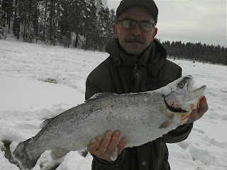 Och Olle fick en också sen ser man Tommy och Kent komma i full fart när vi drillade fisk hela tiden. Sen en halv timme fick jag en till och hade tappa några till sen gick jag ut på djupet och när jag har suttit där en stund ser jag Olle drillar och att han tog fram huggkroken då veva jag upp och skynda mig till honom jag fatta att det var en stor fisk eftersom han tog fram kroken. Olle försökte kroka den men missa då sa han till mig att ta den då stoppa jag ner handen och tog gälgrepp på fisken också vägde vi den. Det var en tjock båge på tre kg. Stort grattis!