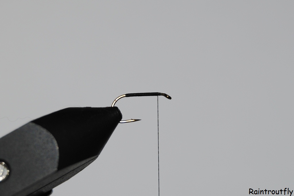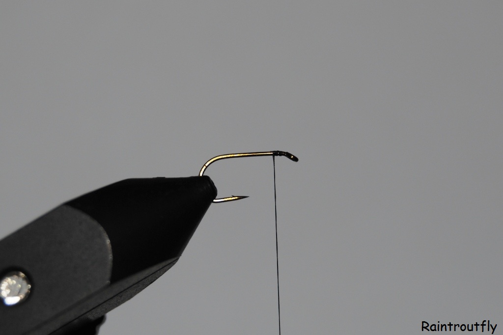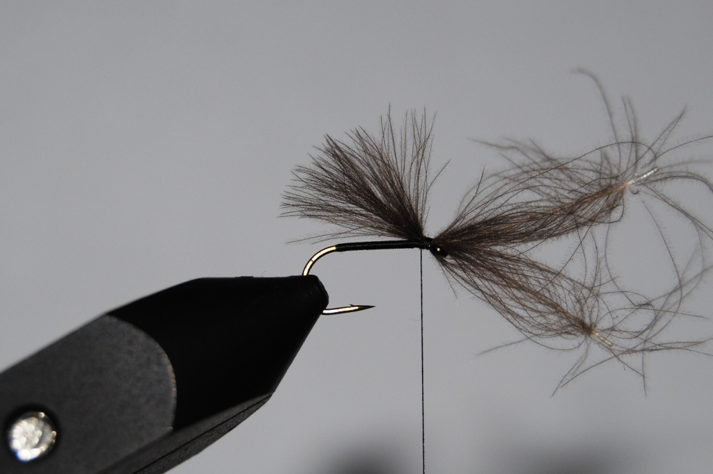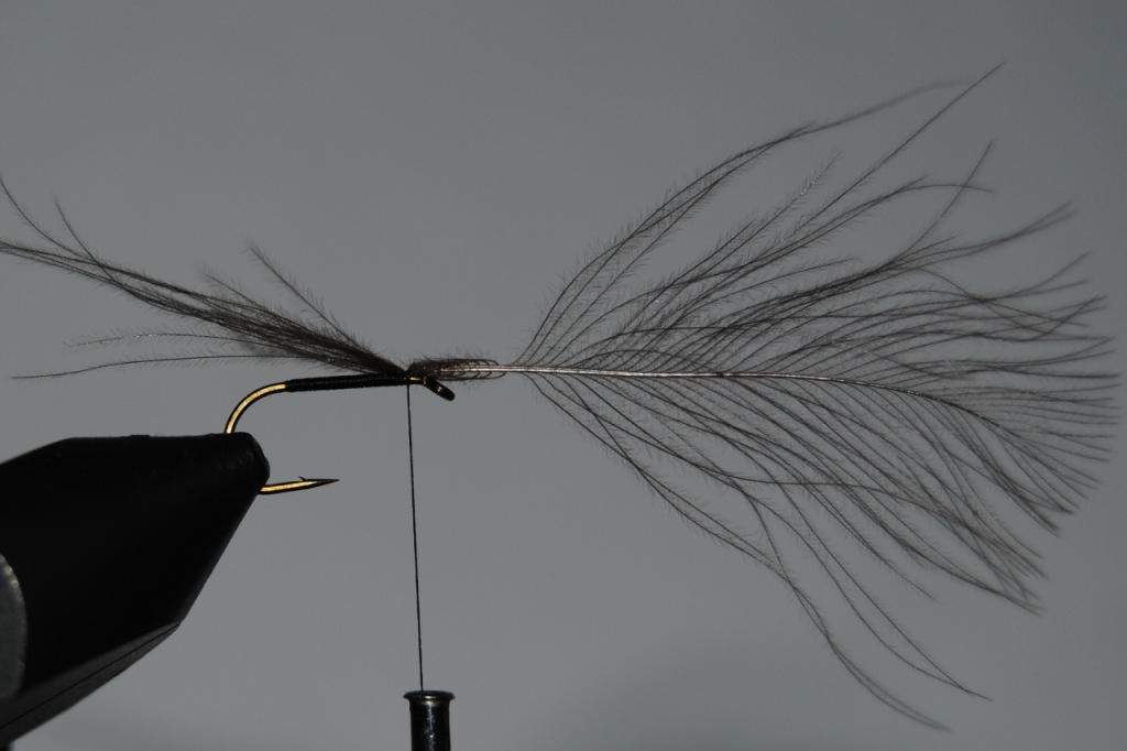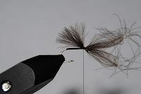 | Ta två relativt små CDC fjädrar och fäst in dem med spetsarna ihop och de tjocka fjäder ändarna mot krokögat. Fäst fast fjädrarna med 2-3 lösa varv. |