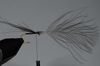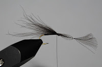 | Välj ut en långfibrig fjäder, klipp av de allra nedersta "dunet" på fjädern. Fäst sedan fast en liten bunt med fibrer (se bild) klipp av fjädern så nära kroken du kan. |