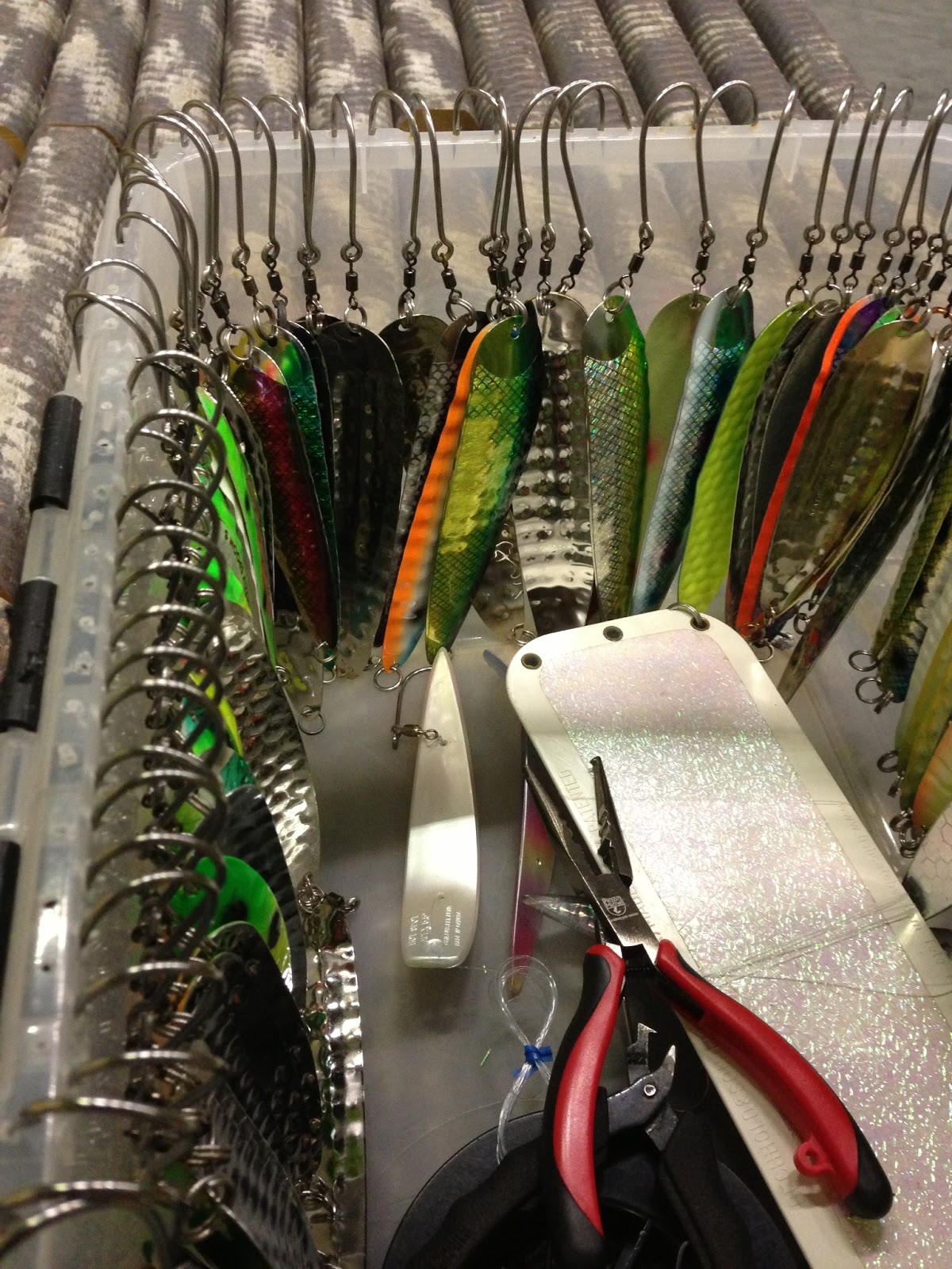 Jag har hunnit med att fila och byta krok på många av mina skedar inför vårens fiske. Kör nu enbart med enkelkrok och har hittills inte tappat en fisk på dessa krokar. Det blir också väldigt smidigt att kroka loss laxarna.