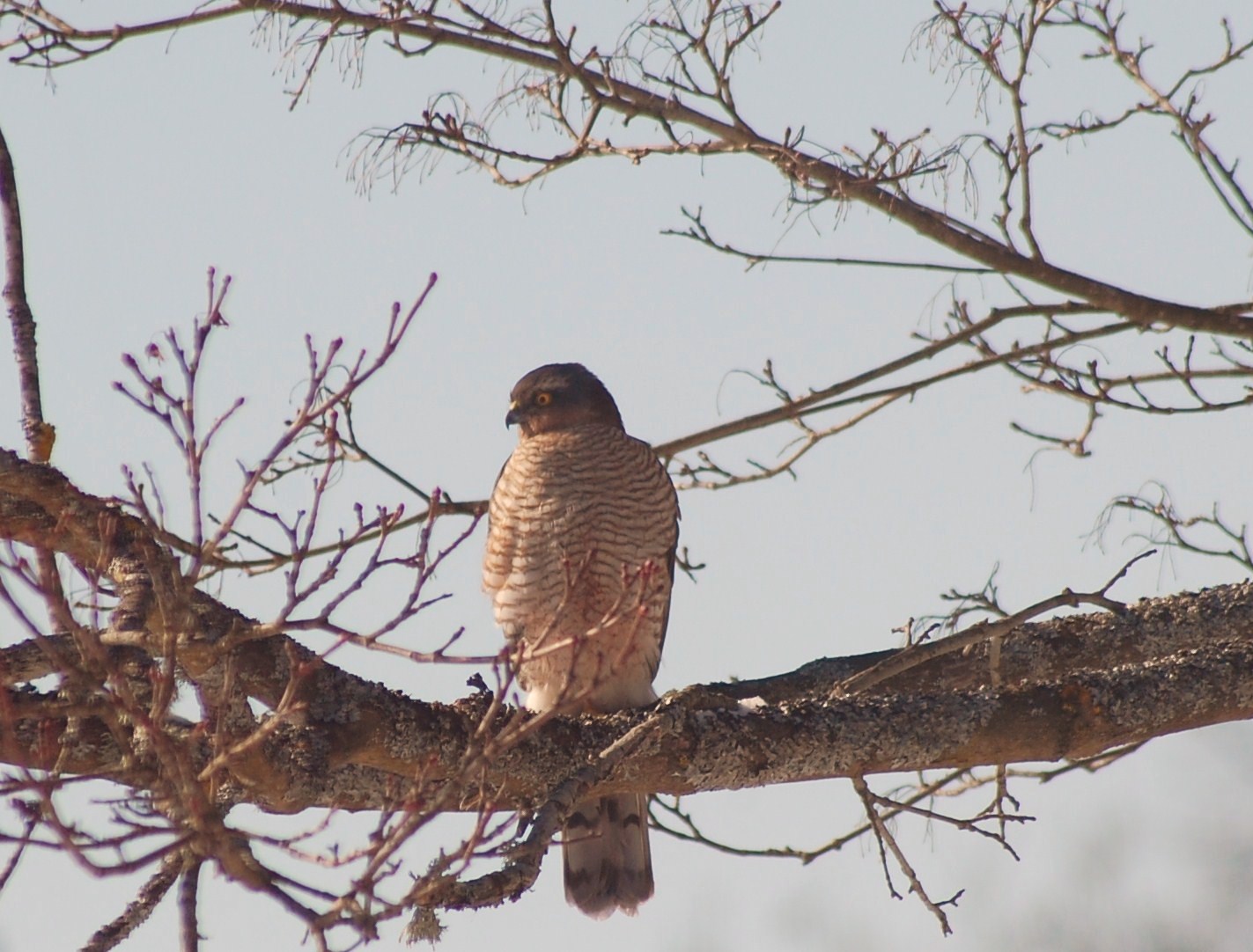 Den lyckades inte få sin middag och till slut tröttnade den och satte sig 25 meter bort i ett träd, jag ner i källaren och hämtade 300 mm objektivet och här har vi den trötta, men blixtsnabba flygaren.Han var nog ringrostig efter den långa sega vinter, som fortfarande hålla oss alla i ett säkert grepp och jag hoppas han klarar sig ett tag till, för det ska hålla på med kalla nätter, ett bra tag.