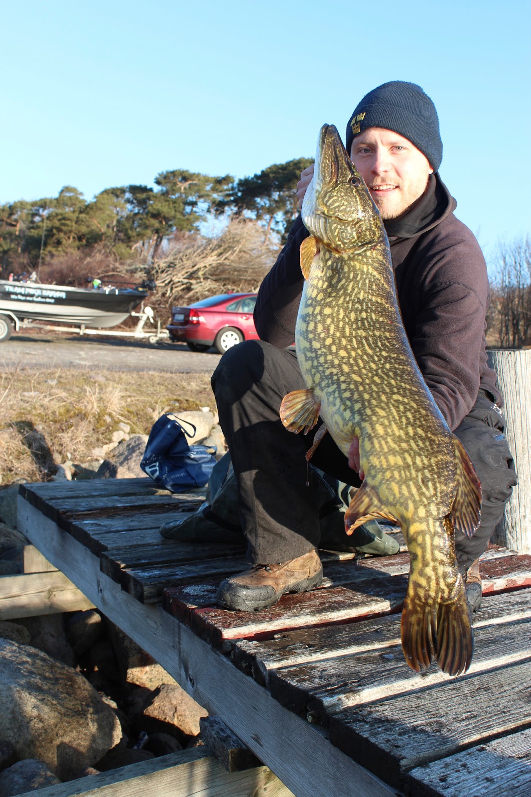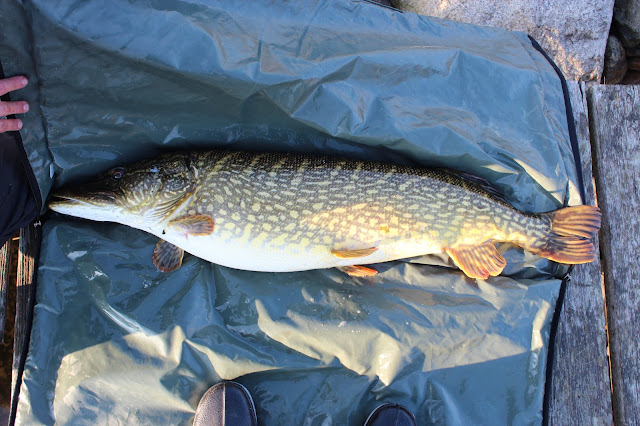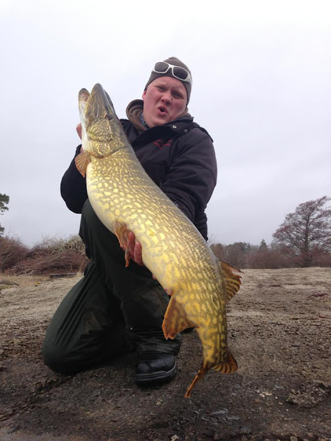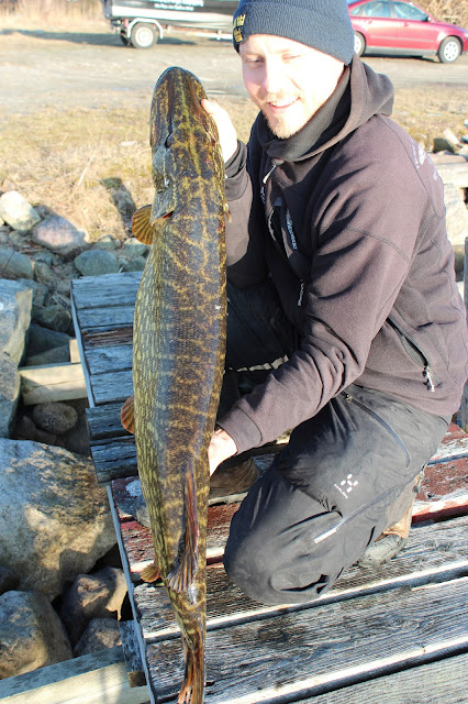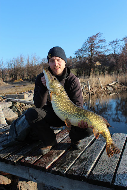 I söndags var det då dags för premiärfiske i blekinge. Tidig morgon som vanligt Andreas plockade upp mig vid 04:30. Ca klockan 07 var bilen och båten parkerad vid rampen. Med en kopp kaffe i handen njöt vi av morgonsolen. Andreas går bort mot båtbryggan och säger att han ska kolla om det står några gäddor och värmer sig i solen. Han säger då till mig att det står en 5+ i tången och hämtar sitt spö. När jag kommer fram har han börjat fiska på den. Den är otroligt seg. Men det är rätt vanligt de är supersega i det kalla vattnet. Gäddan verkar inte intresserad av betet och Andreas håller på ett bra tag innan den tar. Jag tar fram håven och håvar den rätt fort. Väl i håven märker vi att den var lite större. Andreas hämtar våg, måttband, säck och matta. Gäddan är 116cm och 10,9 kg. Efter att han granskat korten så ser vi att det är precis samma gädda som Tompa tagit dagen före. Den hade helt enkelt inte lämnat hamnen. Inte konstigt att den var seg och ointresserad. Andreas sa själv efteråt att hade den varit en PB gädda hade han aldrig räknat den som PB. Detta var Tompas gädda och det kändes inte helt rätt att lyfta den igen dagen efter. Hoppas nu den får leka i fred så ses vi igen till hösten.
