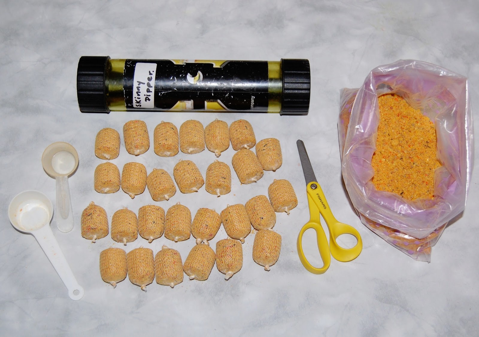 Skinny Dipper är töjbar och det är enkelt att få fram runda bags, som dessa och tätheten i väven gör att även, om du använder små pellets, som dessa 2 mm, så kryper dessa inte genom väven och det är bra.