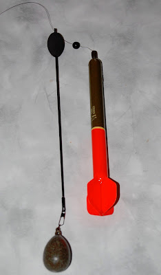 Upptacklingen av ett featurefinder set - up ser du här, stort bly som når ut till platsen, du tänker söka av, eller fiska på, bommen som håller din lina en bit över bottnen, en stoppbeads för flötet och sen ett avlångt markerflöte, lite standard i dessa sammanhang.