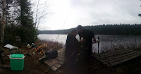 Vi sitter där och surrar i vindskyddet så dyker Roger Lindberg ner för slänten och hälsar på, Vi prata lite om hur vi tog oss dit eftersom det är hans hemma plan vattnet ligger på så kan han tydligen skogarna!
