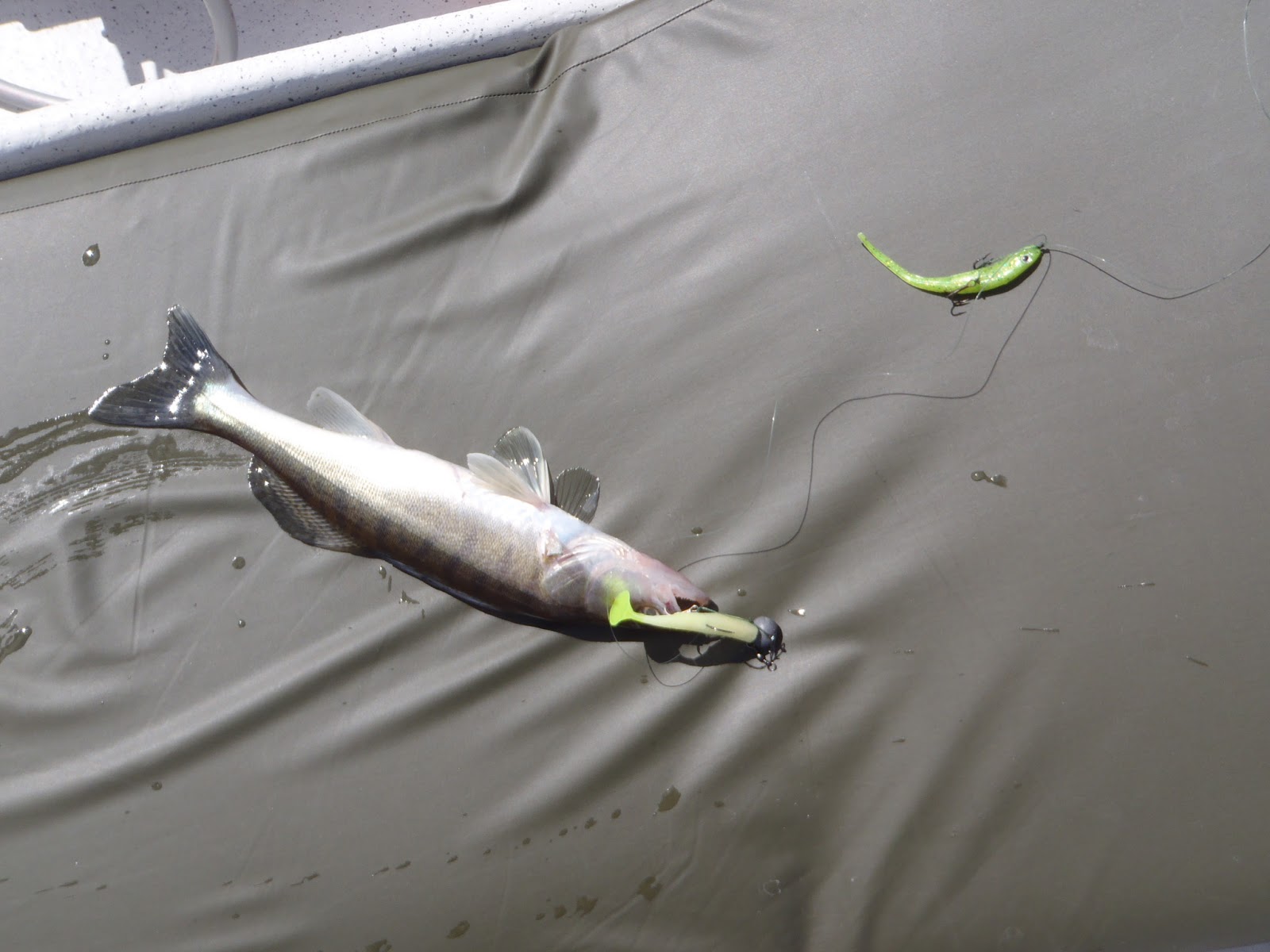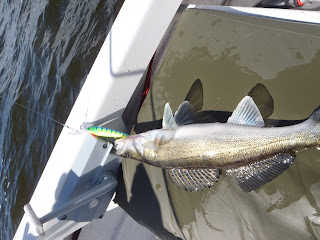 Åter en skön dag på sjön med en massa fisk på kroken. Fick fisk på drop shot, trolling och mest på vertikaljiggning. Största fisk en gädda på runt 3kg följt av en gös på 2.1kg som åkte med hem till middag. Vattentempen hade stigit nästan en hel grad över natten