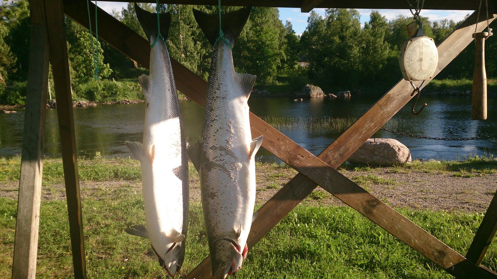 Först drog Hallberg på en, jag sprang och hämta håven . Vi har kommit halvvägs på udden sen hör man Storås hojta att han har en också typ 15 sekunders mellanrum . StoråSs är till vänster en hona på 12.3 och Hallberg den andra en hane på 12.8 kg. Nummer fyra och femman är uppe i Ljusne nu. GRATTIS