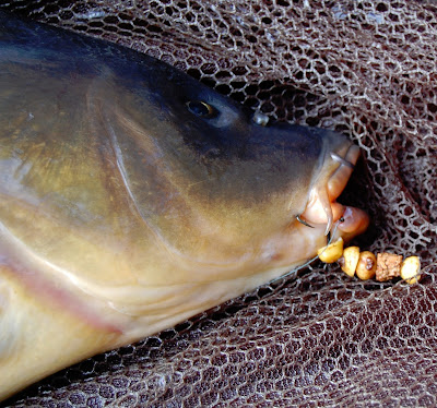 One eye clearly nailed! En av gölens karakteriska fjällkarpar. Jag tar med denna bild för att visa er exakt 9 ut av 10 gräskarpar blir krokade med dessa stapelbeten. Kroken sitter alltid här och en bit innanför käkvinklen och det är ett bra fäste som inte släpper i första taget.Solen kom fram och likaså gjorde karparna från sina hide outs, det blev 13 takes på 5 timmars fiska och 11 fick prova min nya cradle, ingen av dessa 11 fiskar klagade på denna karpvagga, så den måste vara bra.