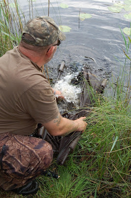 Här är det dags att säga adjö till fisken och den var mer, än ivrig för att komma iväg, men först ska den stå på rätt köl, innan det är dags att släppa taget.