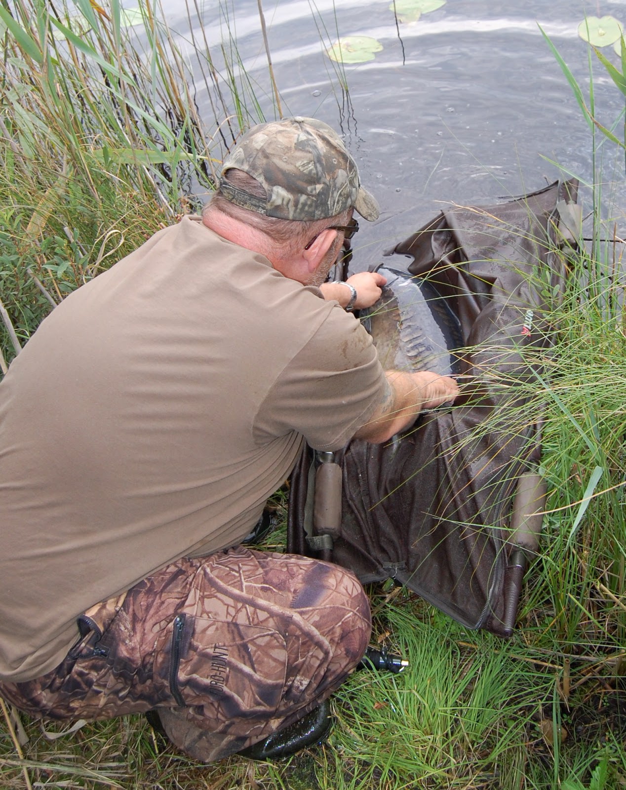 Jag insåg nu min morgontrötthet, men tog det ganska lugnt och drillade fisken en stund och blyet ramlade av i näckrosorna och när fisken kom ut på öppet vatten och stack ut, så fällde jag bygeln och fick ihop håven i en rasande fart och fick sen kontakt med karpen igen och kunde landa den!