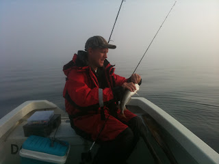 Vi tog oss försiktigt ut på havet i dimman och skickade snart ner våra beten mot bottnen, första nedsläppsplatsen var ca: 20 meter djup. Napp!