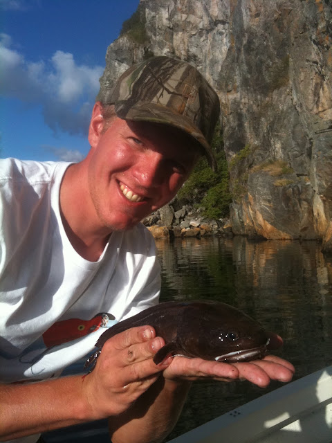 En stolt Berra som efter alla fina gyltor nu blir ännu gladare när vågen visar 400 gram och måttbandet når till 32cm och vi blir tvungna att kolla i Sportfiskarnas Storfiskregister för att kolla vad gränsen går för att få en paddtorsk in i registret. Det visar sig vara 300 gram och denna fisken är alltså inte bara dubbelt ligarekord i både vikt och längd (Peter hade den gamla på 0,15kg) utan också storfiskreg vilket ger 100 poäng extra.