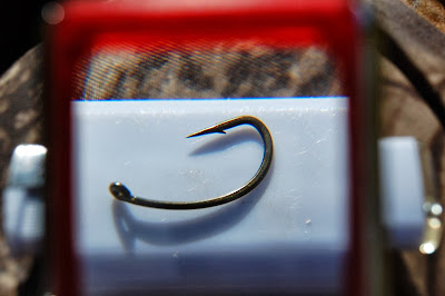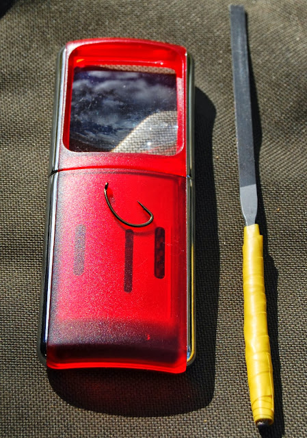Så här har du ett bra hjälpmedel oavsett ljusförhållanden eller tid på dygnet och jag slipar alltid mina krokar i en flugbindningsstäd som fästs på mitt bivvytable och lampan är alltid riktad mot kroken i rätt synfält, vilket en fick lampa inte är och man ser mer med två ögon än ett, so to speak!