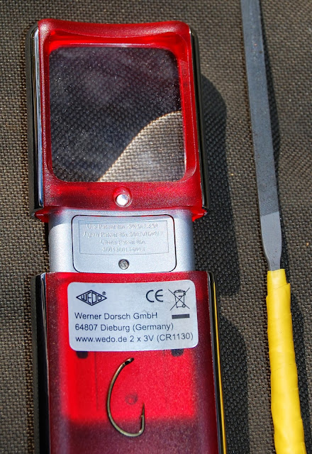 Drar man ut detta förstoringsglas, så tänds en liten bra LED - lampa och man ser krokspetsen hur bra som helst och dessa förstoringsglas finns hos Claes Olsson för en ringa summa pengar och även batterier.