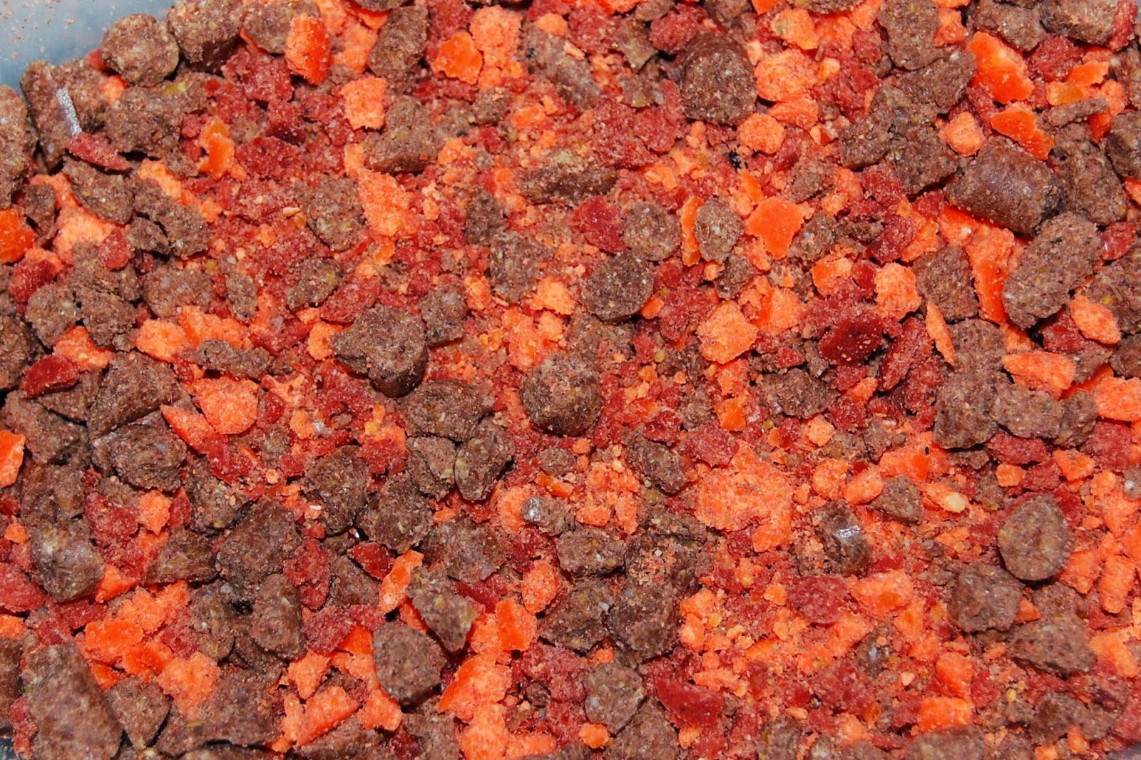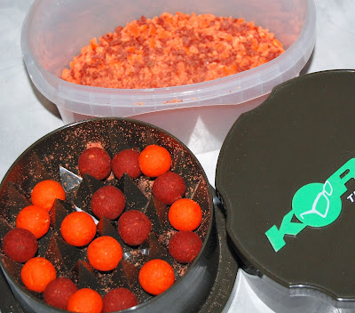 Lika delar Mistral Tutti - frutti och I 40 Red boilies körs till små bits and pieces i en Korda Krusha eller annan kvarn, jag började med 6 av varje boiliesort.Jag fick lite nya idéer igår angående mina bags och deras innehåll, jag har lite Coconut Ice i mina bags och det där lockar fram braxen rätt så duktigt, så nu har jag ändrat mig till en ny crumbmix, som vi lite smidigt, kan kalla karparnas nyårssupé och den är som följer.