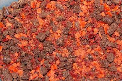 Jag malar ner dessa till denna storlek, som är ca 4 - 6 mm och här sprids nu en förförisk doft av kött och framför allt, en doft av lever, som jag tror kan vara väldigt bra året runt och vi får se vad som händer och hur detta koncept fungerar under dem närmsta dagarna.