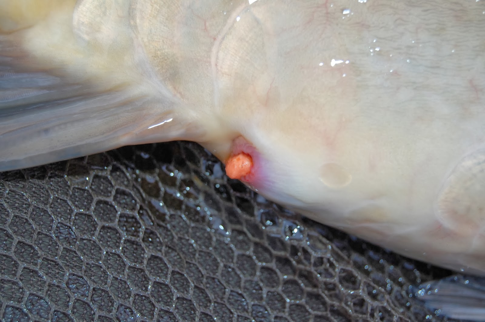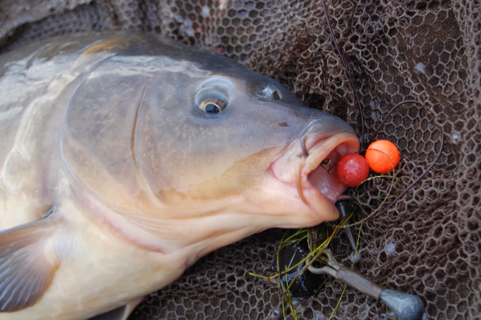 Att karpen hade hittat och fått smak för mina orange Tutti - frutti boilies, det tror jag inte att det finns någon tveka om efter denna bild, det formligen rann ur fisken.