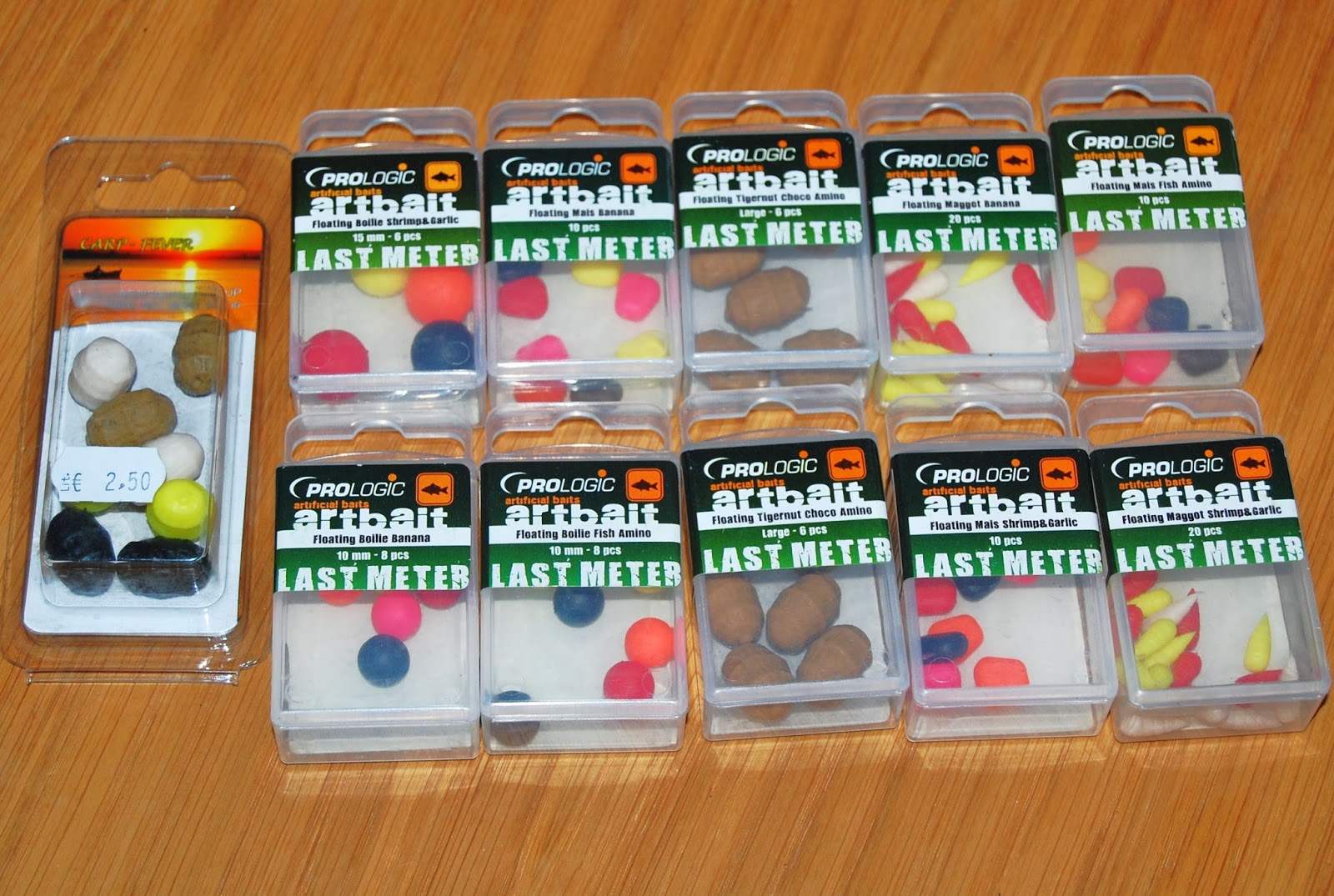 Här är vad jag plockade till mig och det räcker ett bra tag tillsammans med dem jag redan har. Bra färger och ett större antal i paketen, än vad som är brukligt och sen det fina priset och alla innehåller någon form av doft.Så det blev handlat för ca 13 euro och så här i efterhand, ångrar jag att jag inte dubblade mängden, då det var billigt och dessa falska beten är väldigt effektiva att pynta sina krokbeten med, men nu är det som det är och kanske i framtiden, man hittar dem igen?
